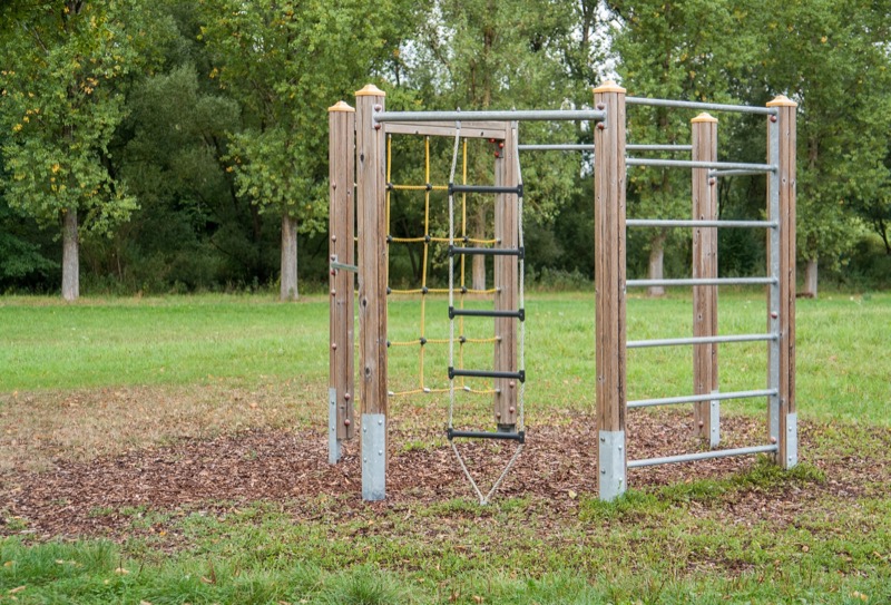 Zwischen den Feldern befinden sich abwechslungsreiche Kletterelemente aus robustem Herkulesseil: ein Kletternetz, ein Kletterseil und eine Strickleiter fördern Motorik, Kraft und Koordination. Ergänzt wird das Sechseck durch ein Edelstahl-Reck, eine Rutschstange sowie senkrechte Leitersprossen – ideal für dynamisches Spielen und Hangeln.