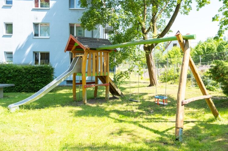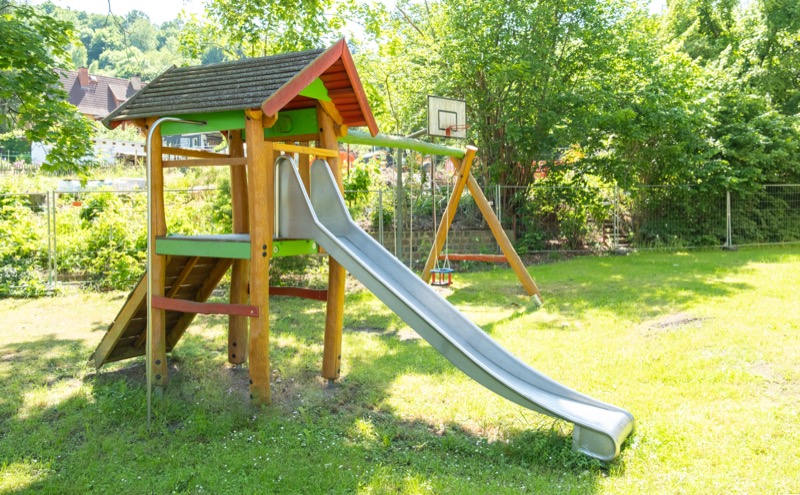 Das 1,20 × 1,20 m große Podest ist mit langlebigem Bangkirai-Holz belegt und über eine Rutsche aus Edelstahl zugänglich. Die stabile Anbau-Schaukel erweitert den Spielwert deutlich: Schaukeln und Rutschen wechseln sich spielerisch ab und fördern Gleichgewicht, Koordination und Spaß gleichermaßen.